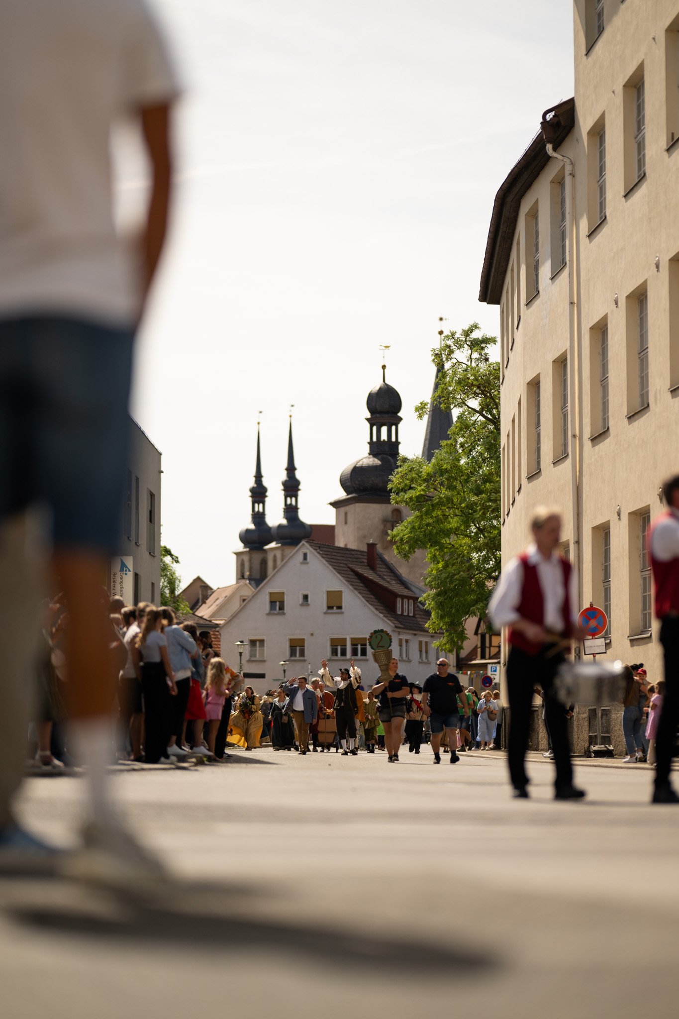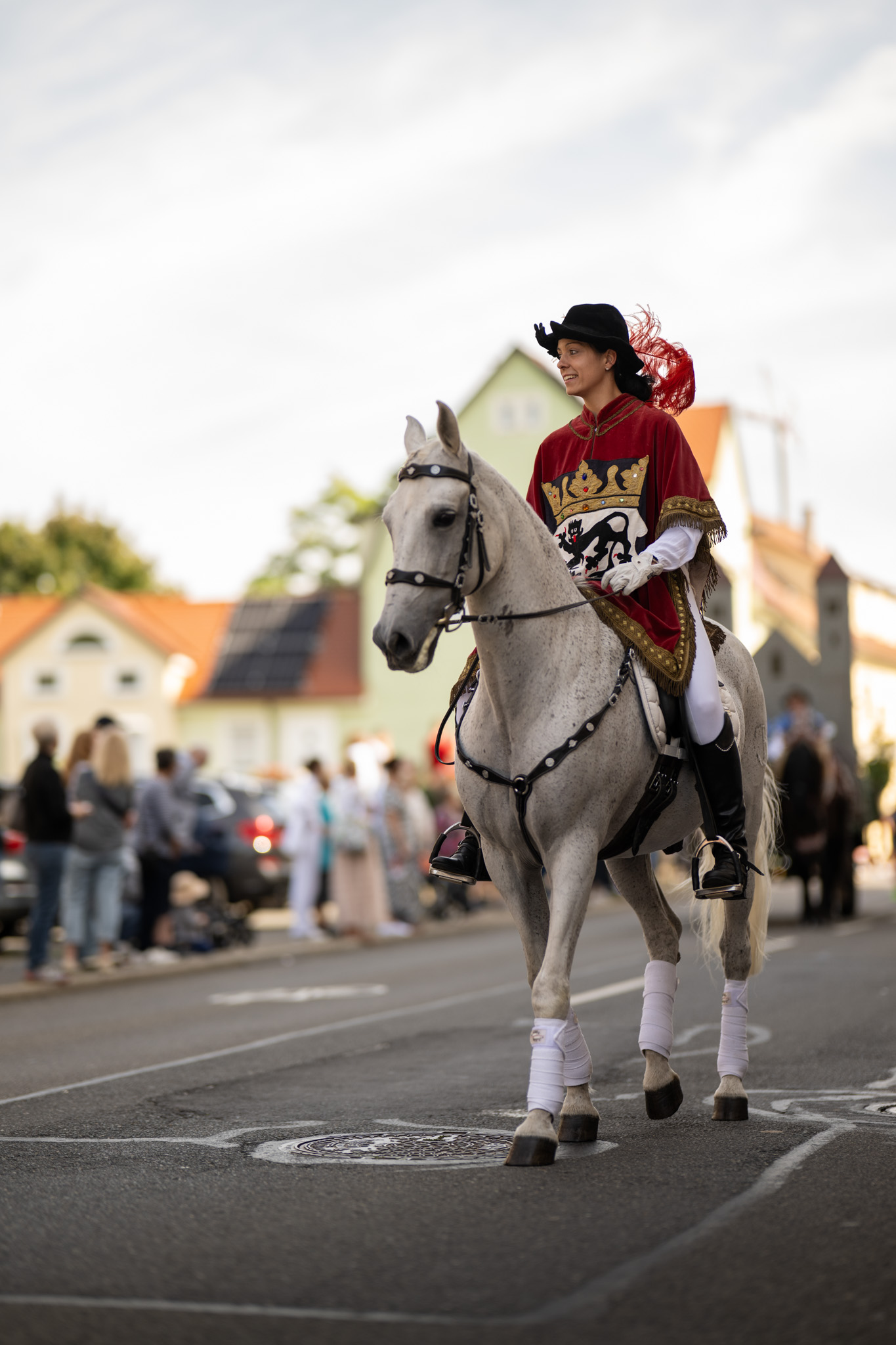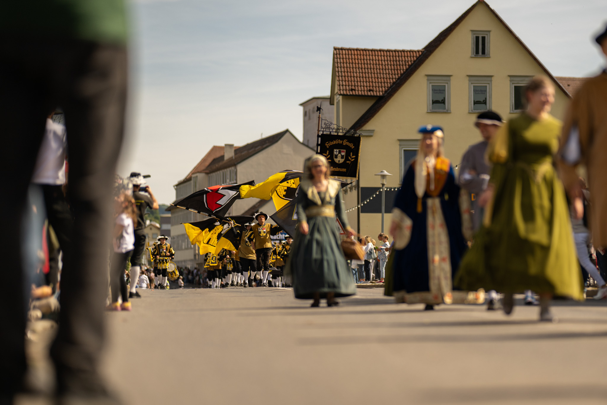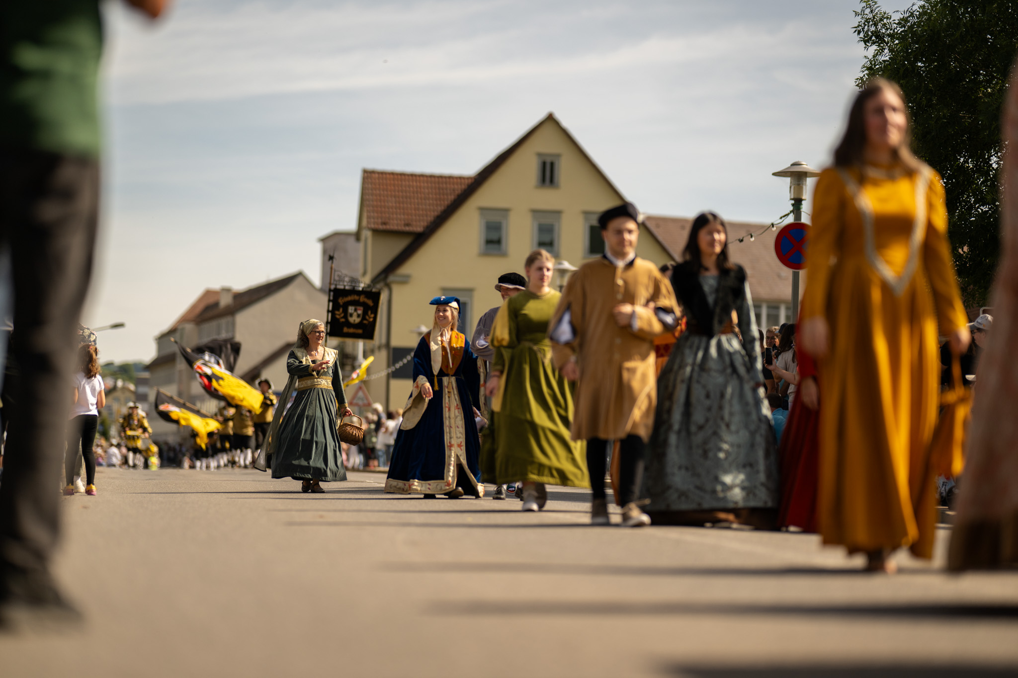 Der Umzug führte durch die Innenstadt von Weikersheim, vorbei an zahlreichen markanten Punkten, die die Kulisse für das historische Schauspiel bildeten. Besonders eindrucksvoll war der Abschnitt über den Marktplatz direkt vor dem Schloss Weikersheim. Hier sammelten sich die meisten Besucher, um die Gruppen in der einzigartigen Atmosphäre zwischen Schloss, Fachwerkhäusern und dem festlich geschmückten Platz zu erleben.