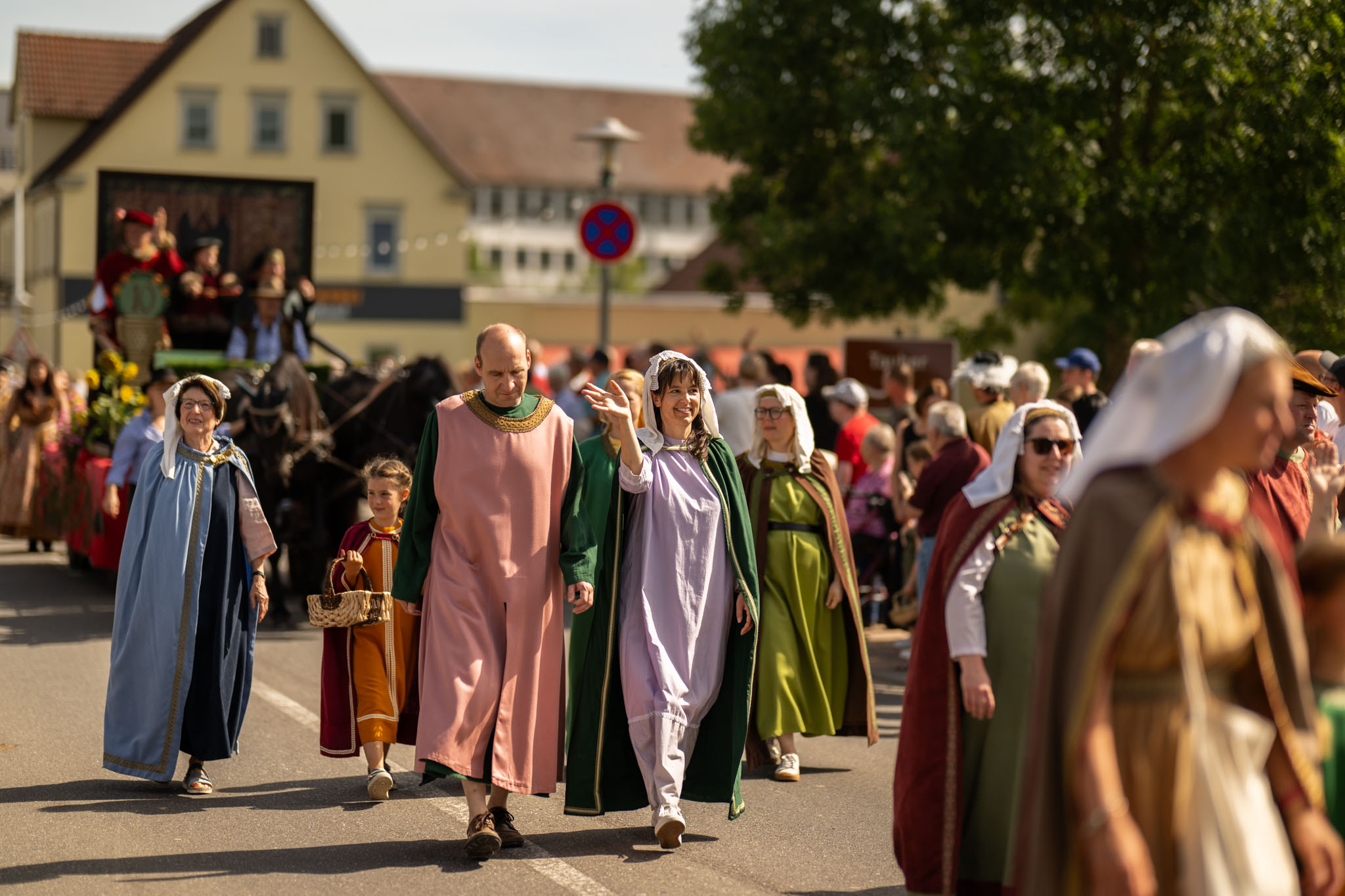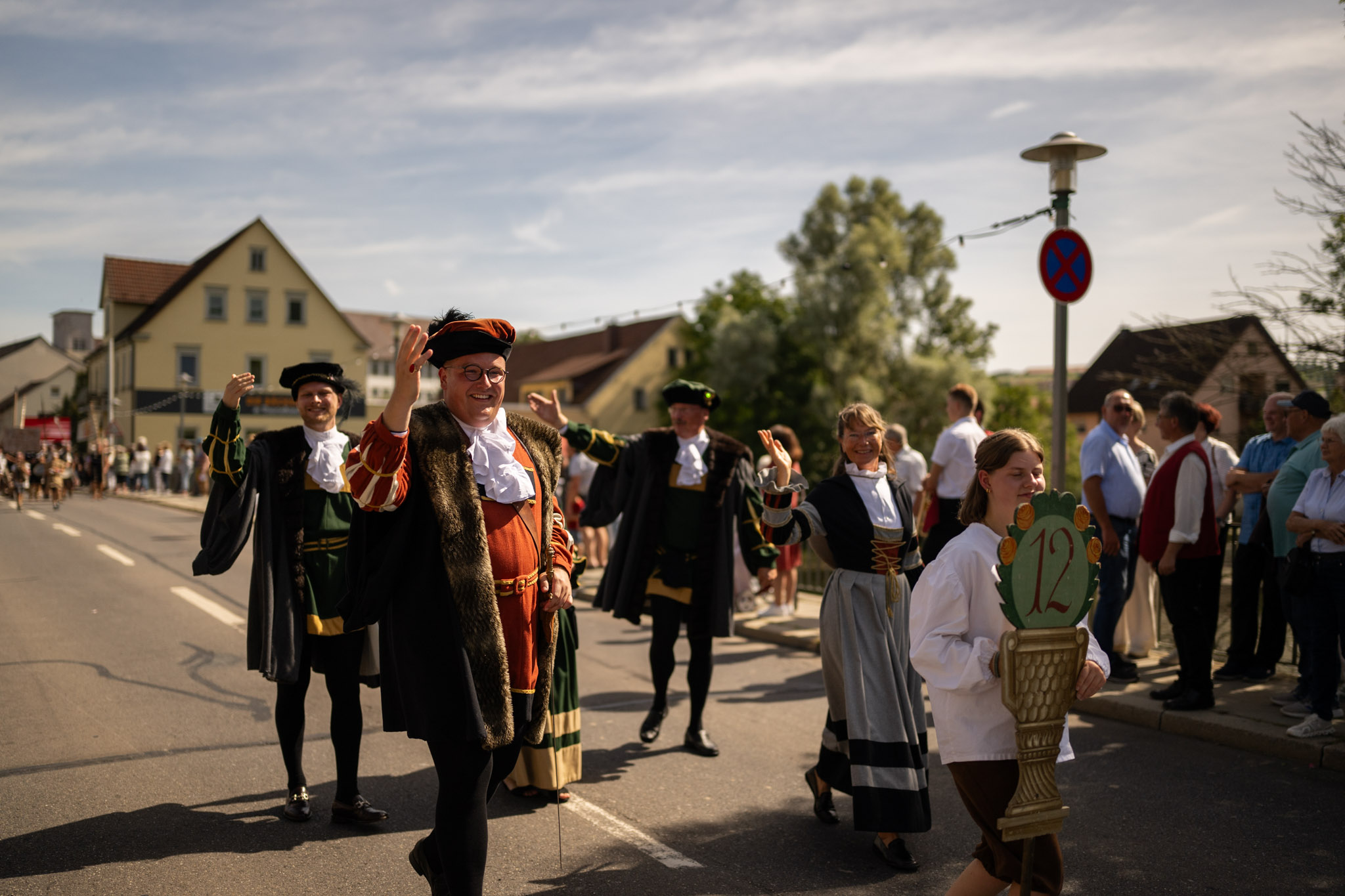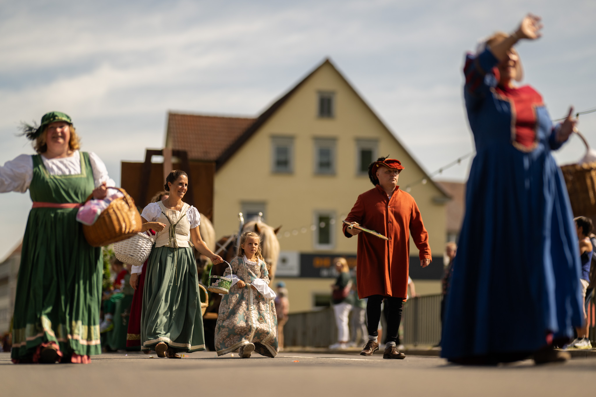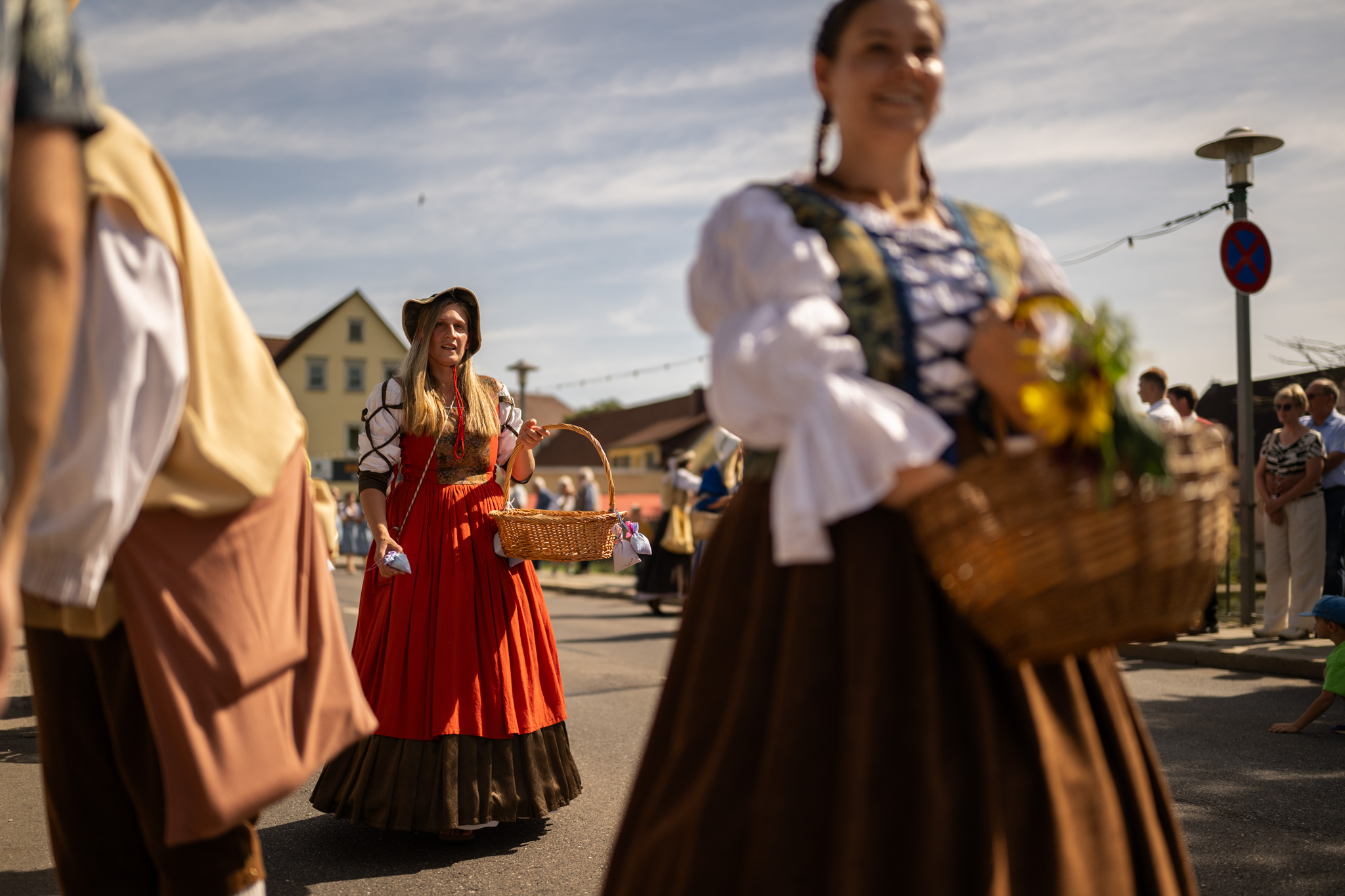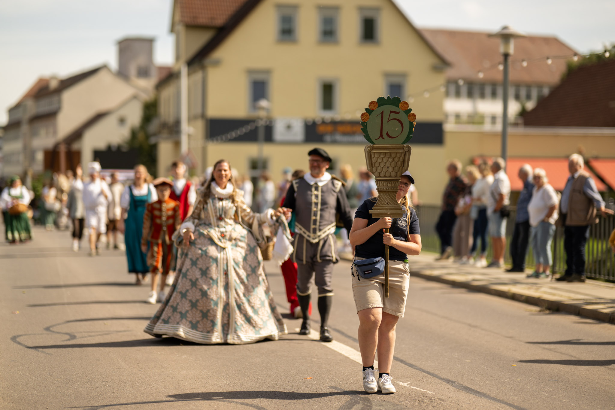 Unter dem Motto „500 Jahre Bauernkrieg“ standen dieses Jahr vor allem Szenen aus einer Epoche im Mittelpunkt, die die Region nachhaltig geprägt hat. Darsteller in historischen Kostümen erinnerten an die Ereignisse des 16. Jahrhunderts und machten die Vergangenheit greifbar. Neben diesen geschichtlichen Darstellungen brachten Musikkapellen, Trachtengruppen und Vereine fröhliche Töne und lebendige Bilder in die Straßen von Weikersheim.